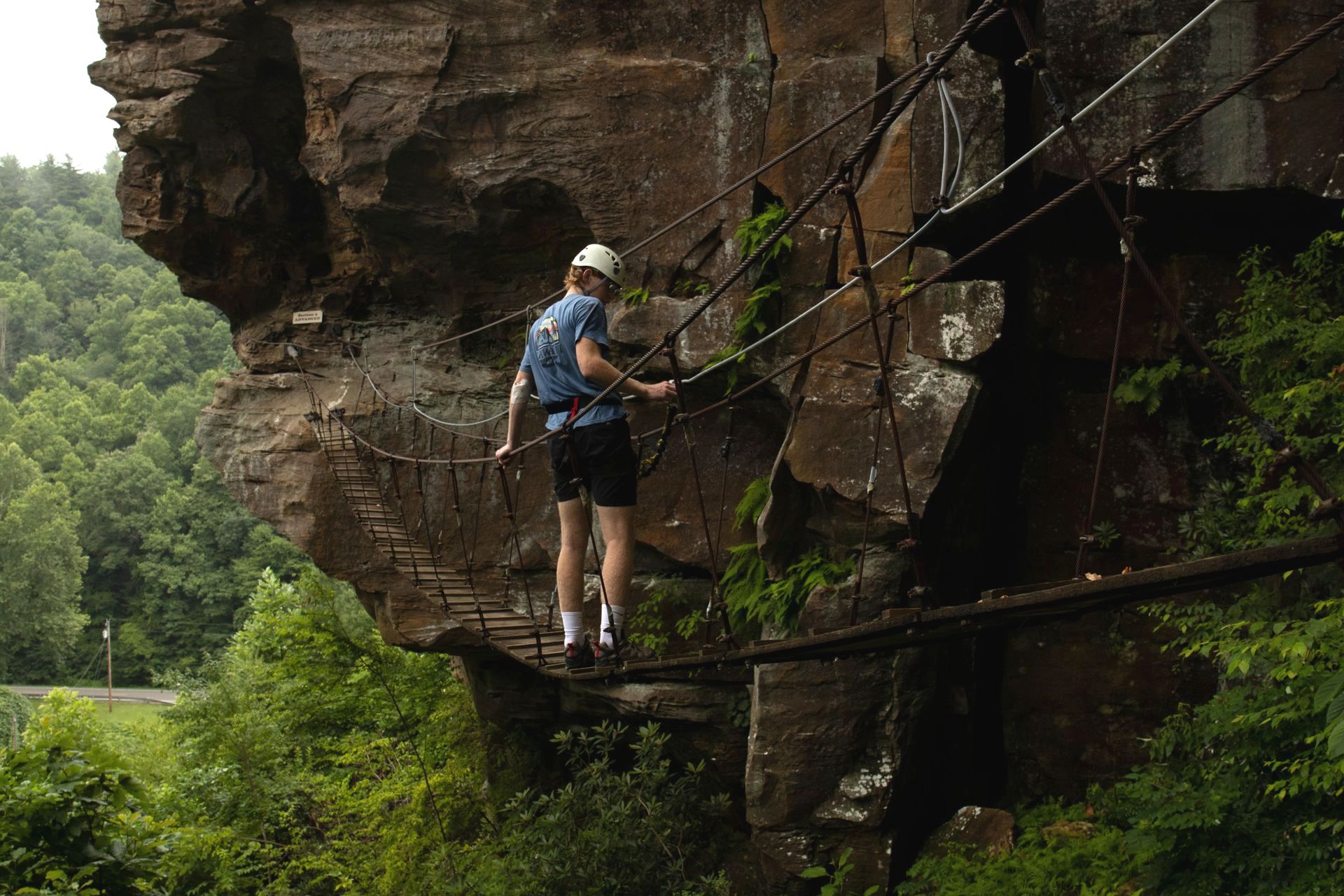 Experience the thrill of the first Via Ferrata in the United States. This unique climbing system, featuring cable and iron rungs, offers an unforgettable adventure for climbers of all skill levels. Whether you’re a newcomer eager to reach new heights or an experienced climber looking for a dynamic way to cross-train, our Via Ferrata provides stunning views and an exhilarating challenge. Centrally located to all the hotspots for climbing and hiking in the Red River Gorge, KY, it’s the perfect starting point for your outdoor adventures.